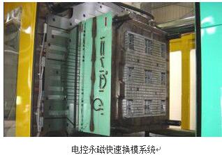 電控永磁快速換模系統(tǒng)主要是針對傳統(tǒng)注塑機、沖床、合模機裝夾模具時間長,操作復雜,安全性低而設計的,該系統(tǒng)采用電控永磁模板及動模板,只需經(jīng)過簡單的充退磁動作,就能裝夾和更換模具,真正做到3分鐘換模,它既可以安裝到新機中,作為標準配置銷售給終客戶,也可以對正在使用機臺進行改造,使傳統(tǒng)機臺具有3分鐘快速換模功能而不會改變原來機臺的結構,即實用又方便。那么